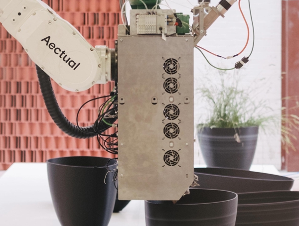 △Aectual公司的一臺(tái)3D打印機(jī)正在生產(chǎn)一個(gè)環(huán)保的花盆。圖片來(lái)自Aectual。