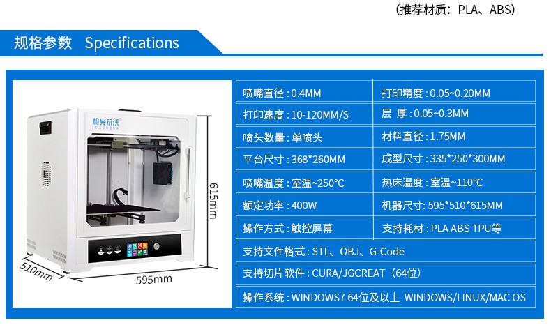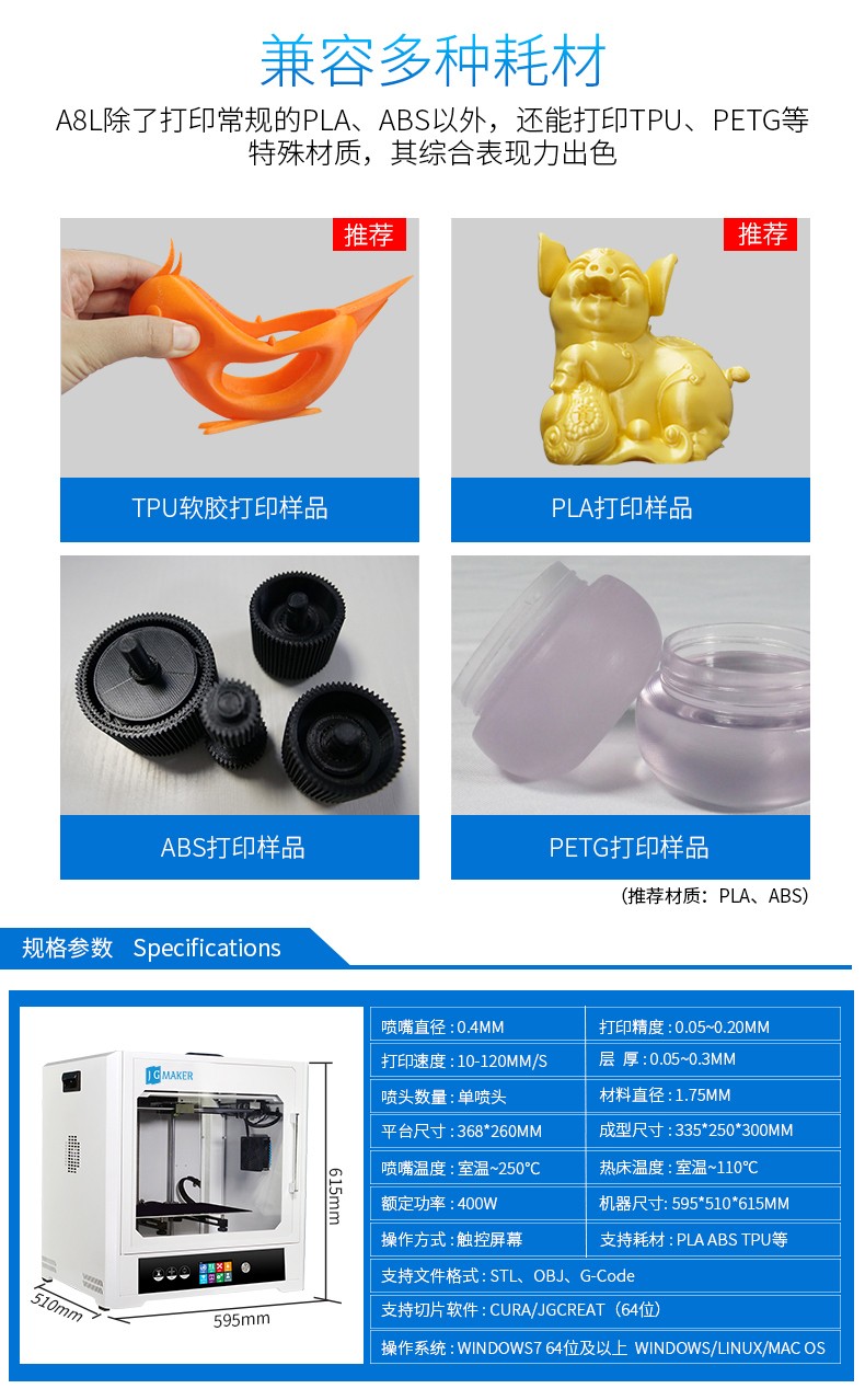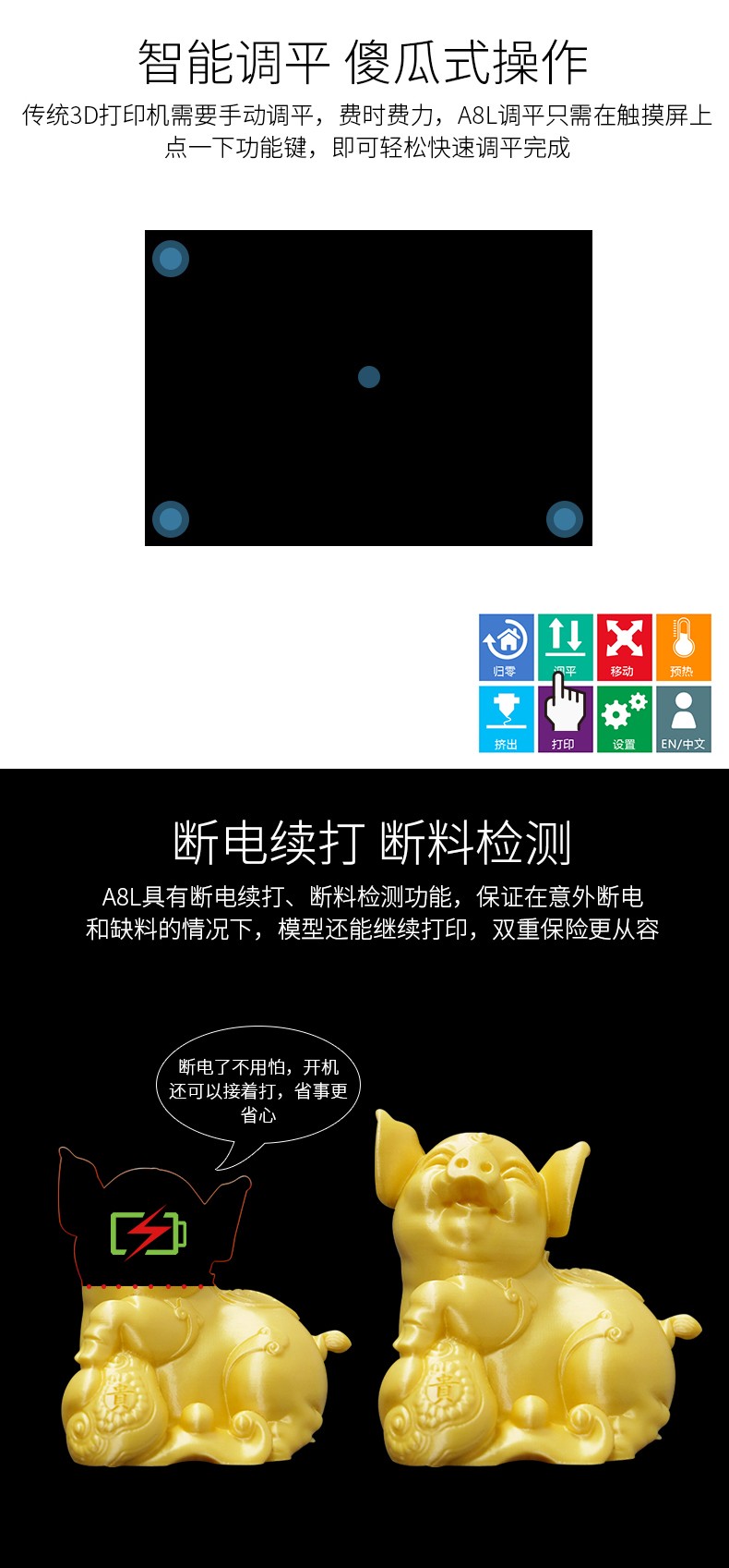 4.3英寸電容觸摸屏,清晰美觀,操作簡單;FA特制平臺,打印完成可取下平臺,輕松取模;模塊化一體式封閉設計,提高模型打印成功率;內置空氣過濾系統,有效濾除打印過程中產生的顆粒;具有暫停續打、斷電續打及斷料檢測等功能;高精度,大尺寸打印,可應對各種結構復雜的手辦模型