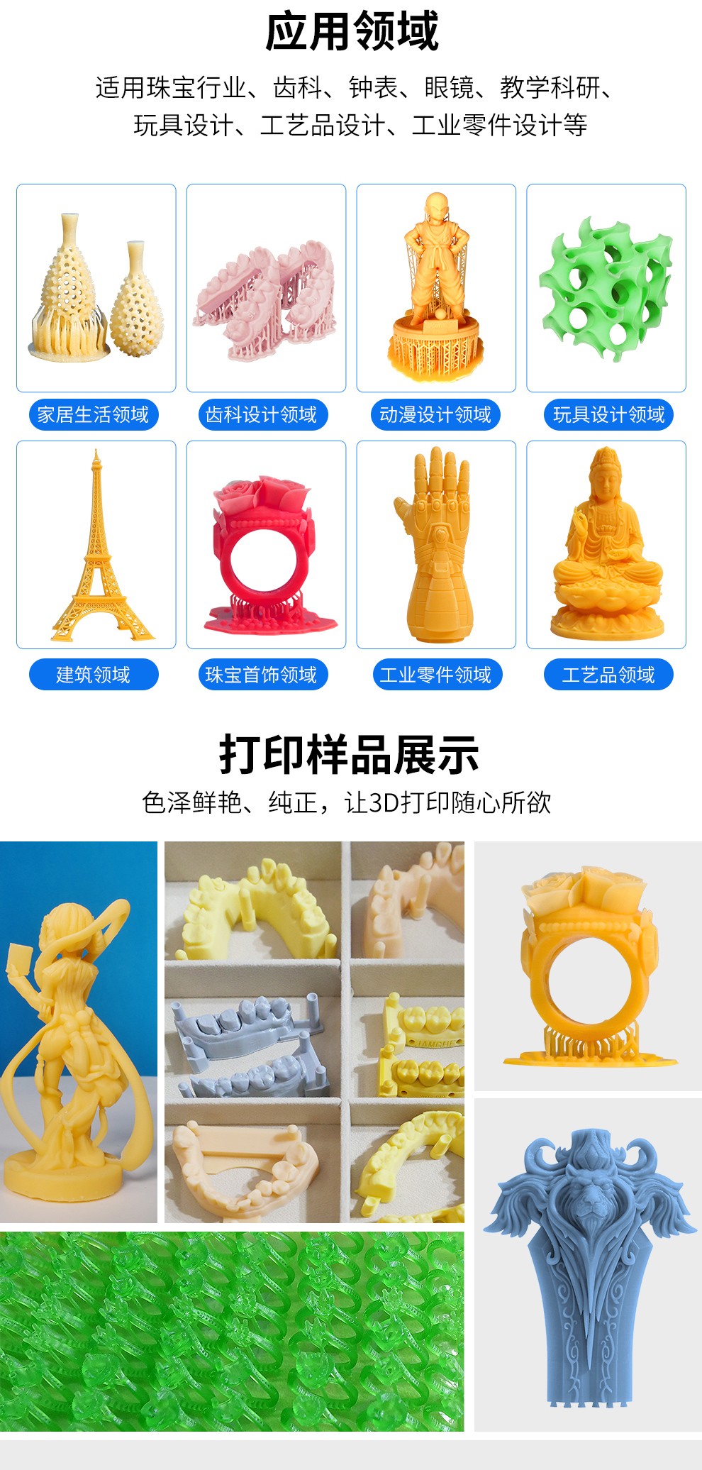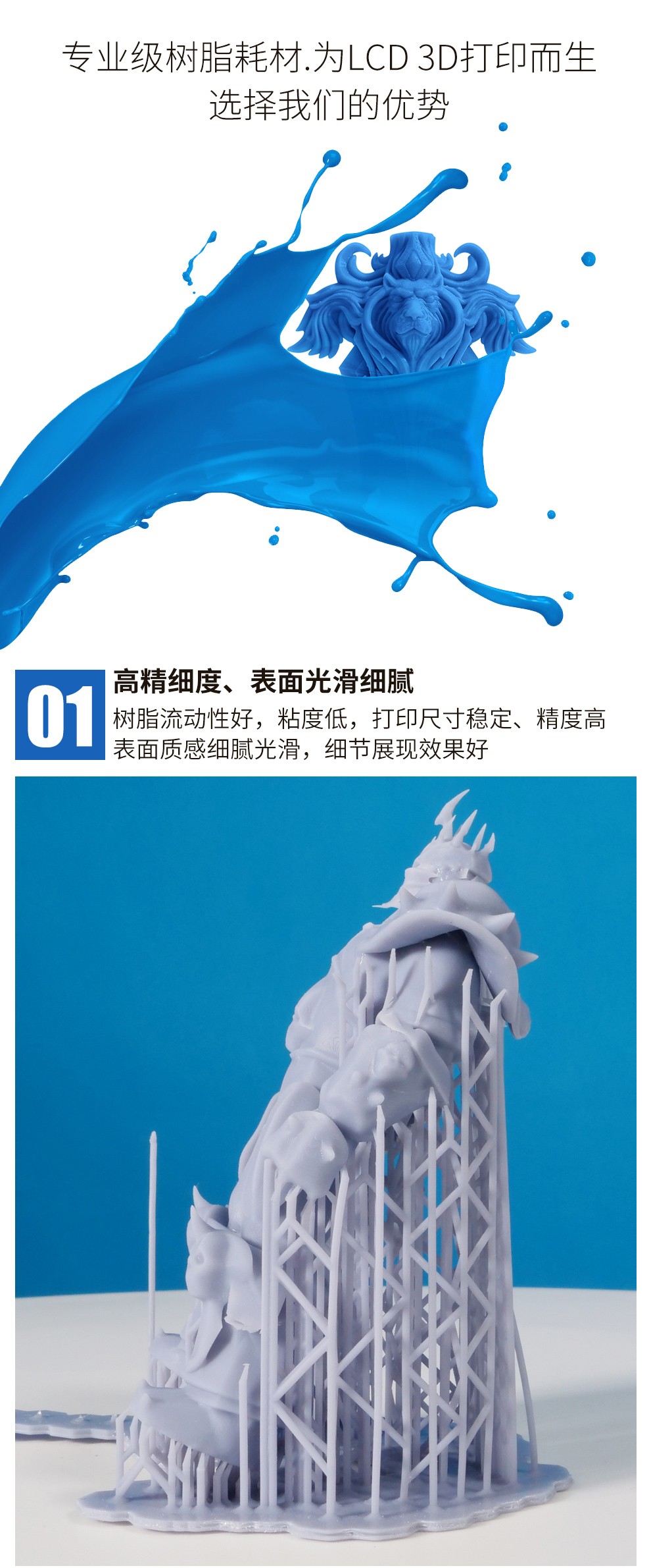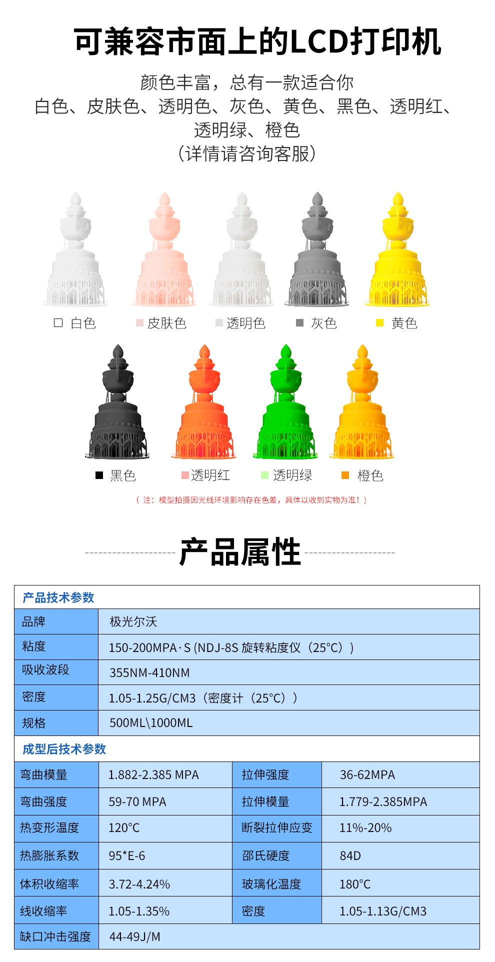 通用剛性樹脂耗材,高精細度表面光滑細膩,收縮率低、高韌性,誤差更小,高硬度、耐高溫,固化速度更快更穩定,兼容市面上的LCD 3D打印機